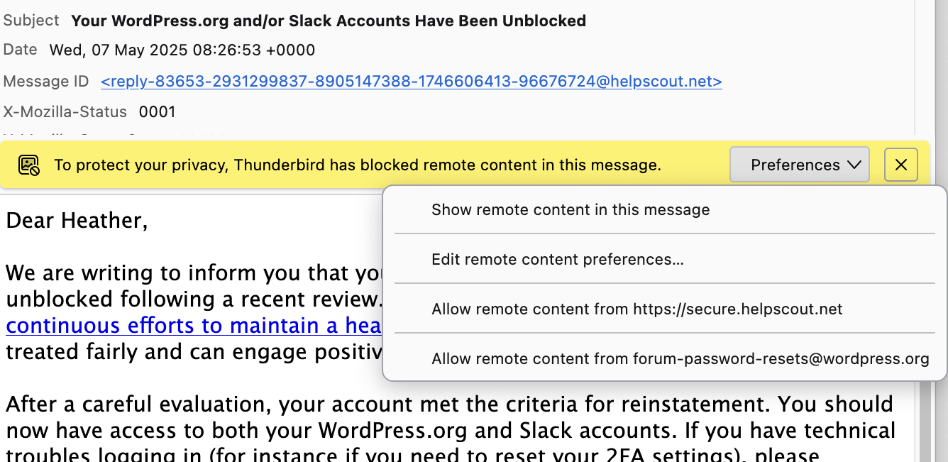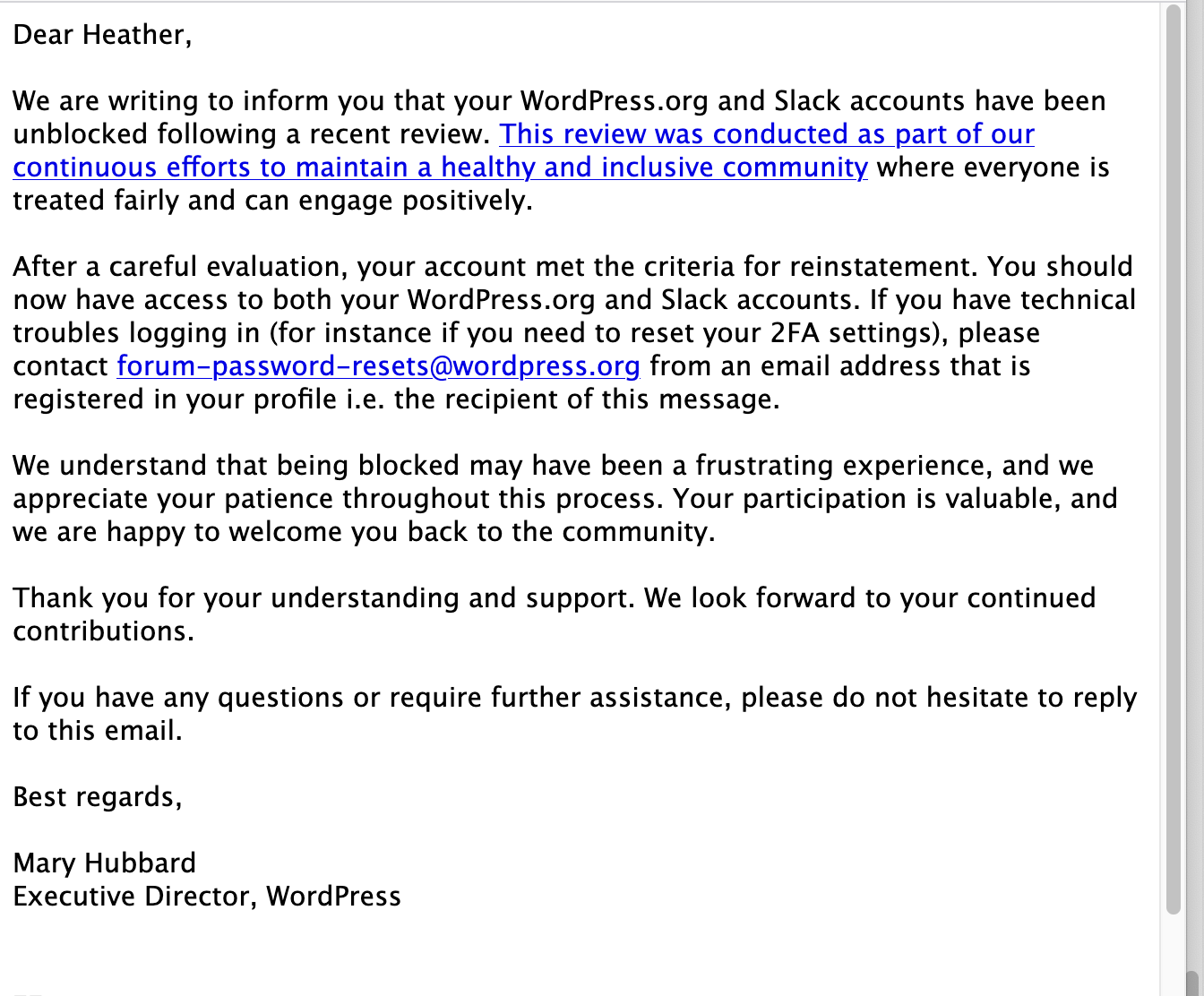 Apparently, “he” published a blog post on the official WordPress blog, not his personal blog, announcing to the world that he had cancelled my WordPress.org account.