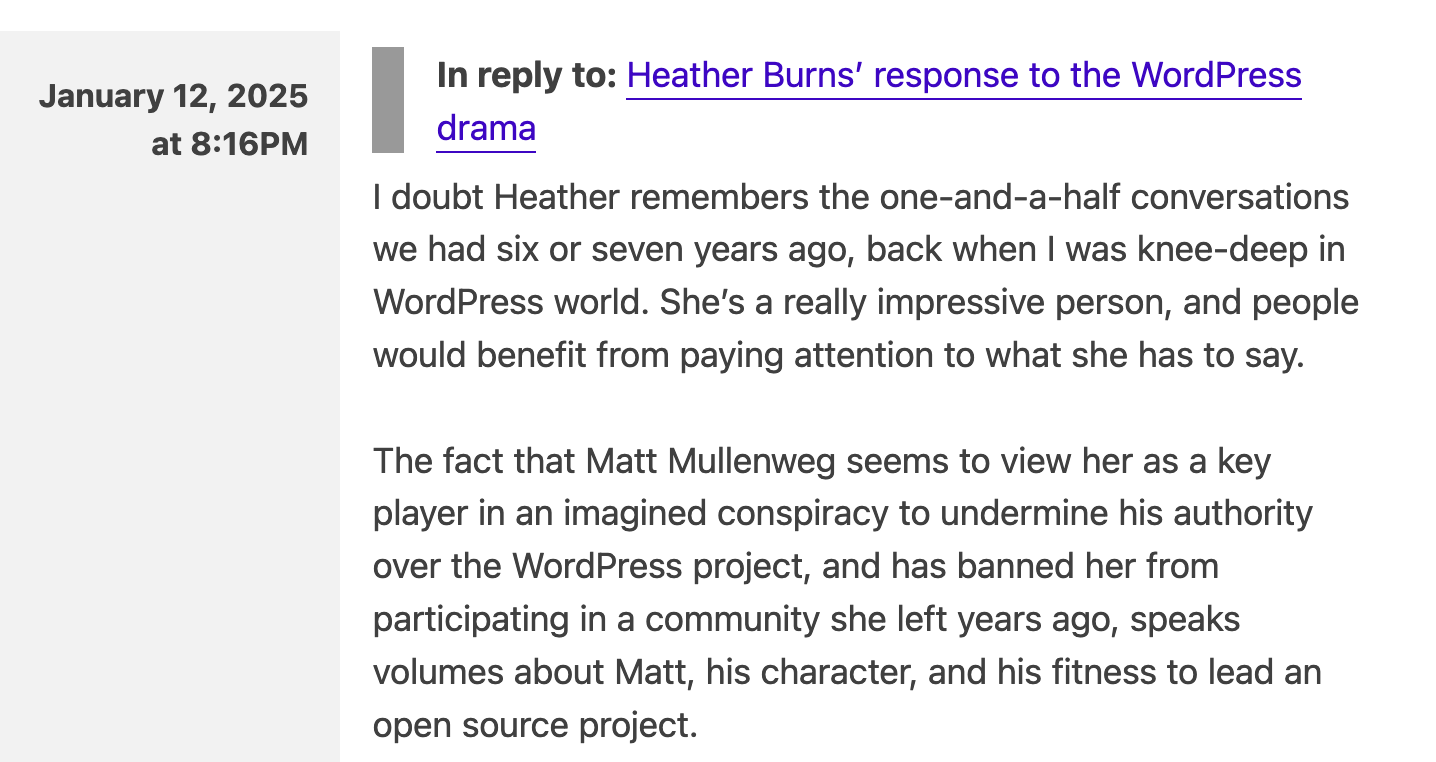 […] expressed his thoughts on his Bluesky account, while Heather responded to Mullenweg’s actions on her blog, where she accused him of harassment. Sé […]
