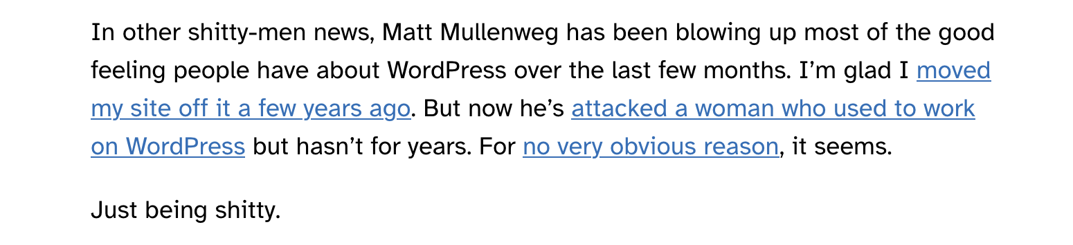 […] official blog post which specifically mentioned a former WordPress contributor, Heather Burns, and driving a ton of harassment her way. A dude in Matt’s position definitely knows what will happen when he does […]